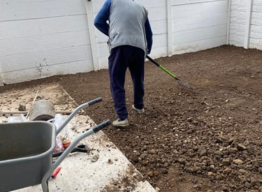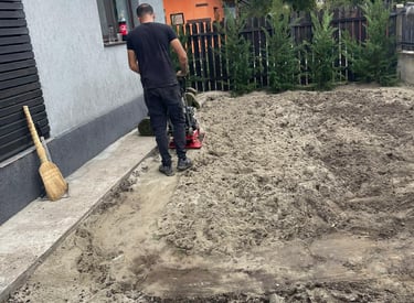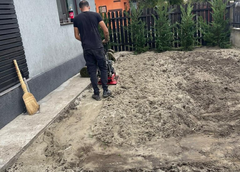 Pregătim terenul prin curățare, afânare și nivelare atentă, pentru a obține o suprafață dreaptă și stabilă. Asigurăm și panta corectă pentru drenaj, astfel încât apa de ploaie să nu băltească.