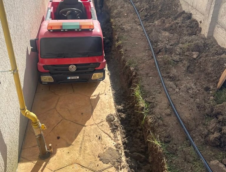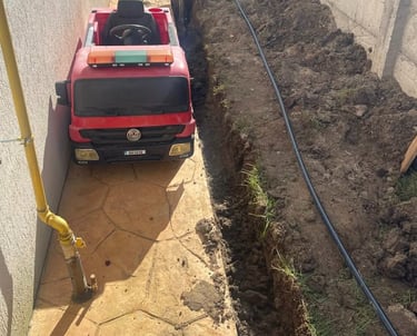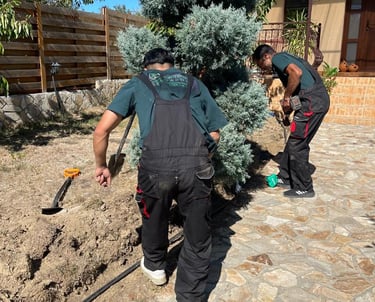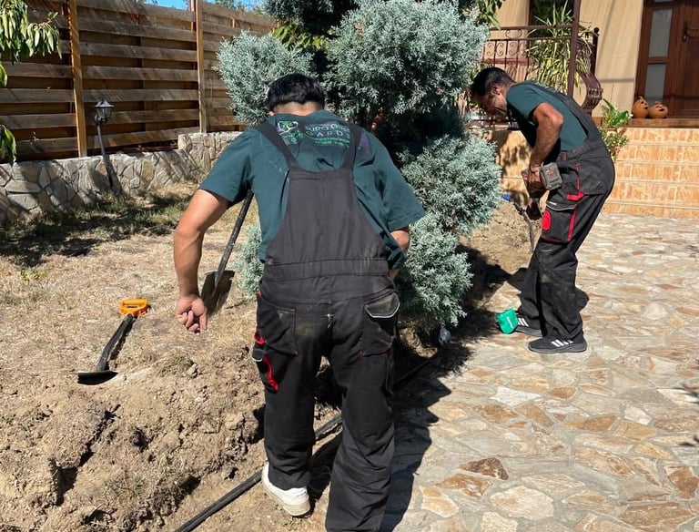 Sapam sanțuri cu precizie și montam tevile exact în zonele necesare, astfel încât apa să ajungă direct la plante și gazon.