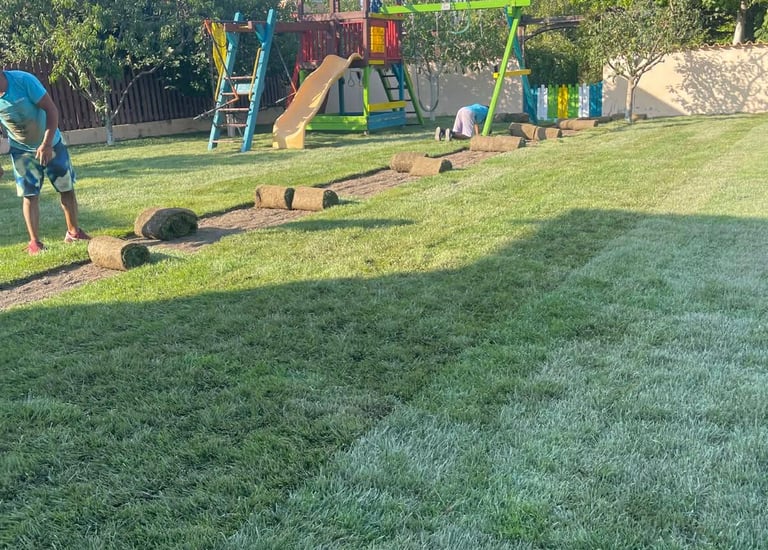 Montăm gazonul cu atenție și precizie, asigurând o îmbinare perfectă între rulouri pentru un aspect uniform. La final, tăvălugim și udăm corespunzător pentru o prindere rapidă și o dezvoltare sănătoasă.